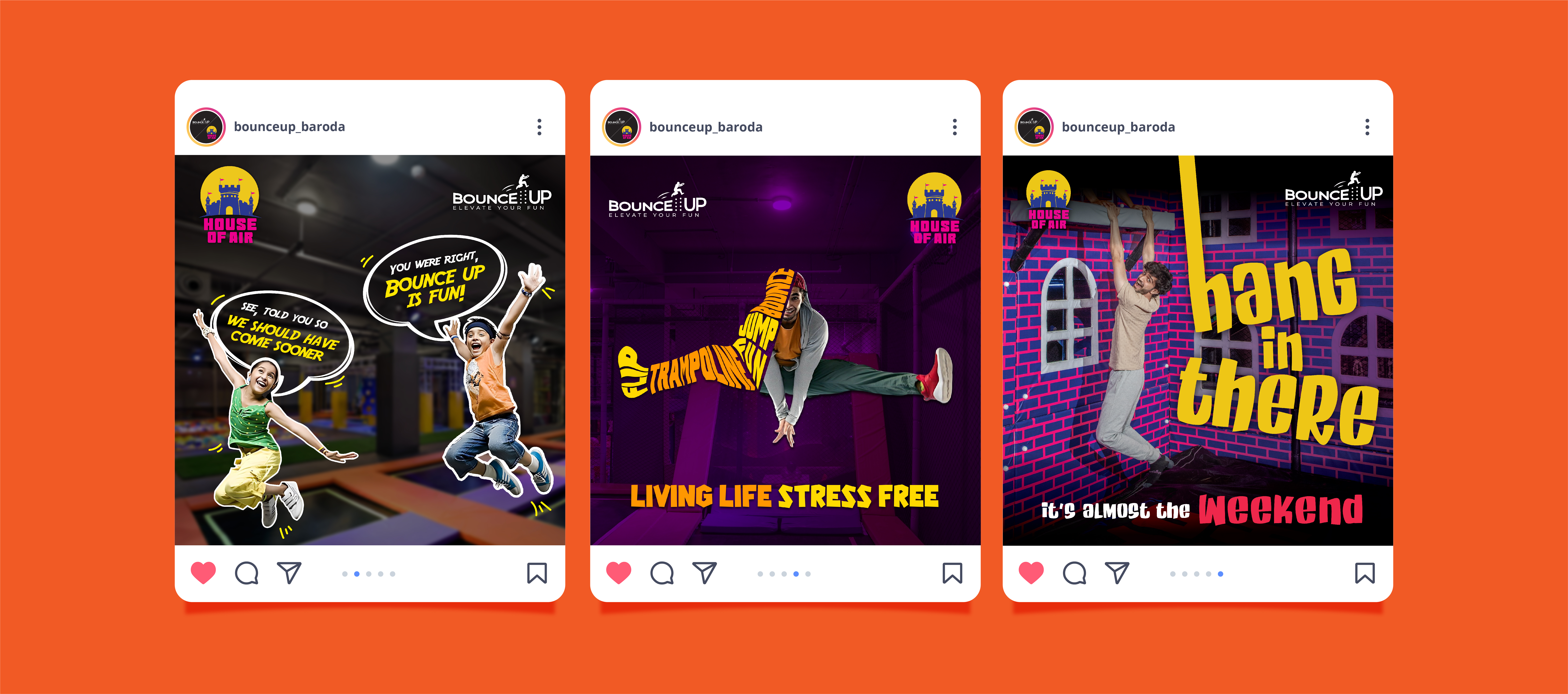 Bouncing Up with ideas is what we do for this client on a regular basis. Bounce Up is Vadodara’s first and only trampoline park. It is a place where young and old can have fun together with no age bar. Another vertical of Bounce Up is House of Air, India’s largest inflatable park. House of Air brings your inner child to life. You should definitely visit these parks to have a fun time.